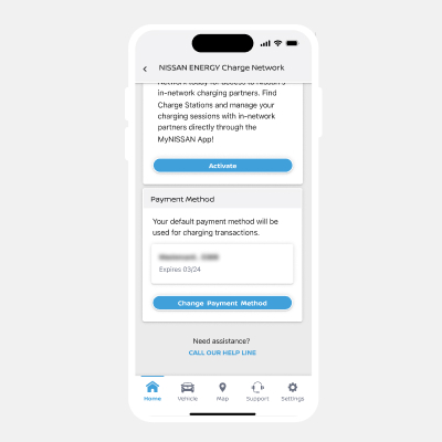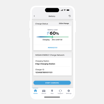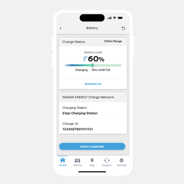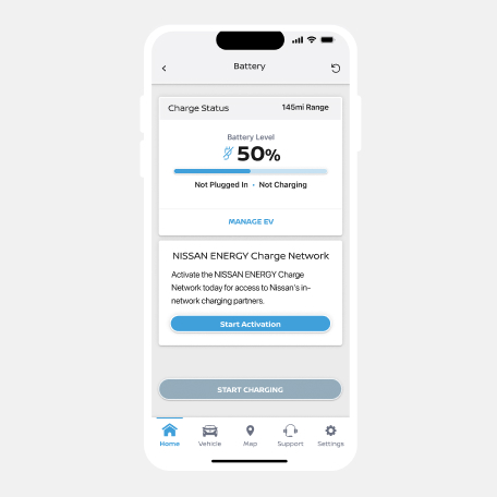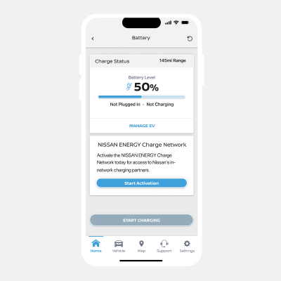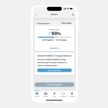 Navigate to the battery page by clicking "Charge" from the home page. Select the start activation button to connect your profile to the NISSAN ENERGY Charge network.